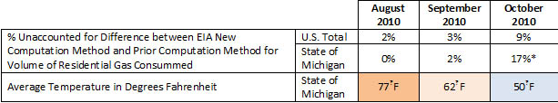 On the EIA website, the EIA described the adoption of new “Corrective Measures” in 2010-2011 in an effort to explain away the (balancing) errors in an article “Seasonality in the Natural Gas Balancing Item: Historical Trends and Corrective Measures” http://www.eia.doe.gov/pub/oil_gas/natural_gas/feature_articles/2010/ngseasonality/ngseasonality.html and provided values in a spreadsheet “volume_comparison.xls” (U.S. Natural Gas Residential Comsumption Comparison) comparing the “Residential Volume - Current Method (MMcf)” with the “Residential Volume - Prior Method (MMcf)” for the months of October 2010, September 2010 and August 2010. Extracted highlights from that information are summarized below along with the approximate average temperatures in Michigan in late 2010: