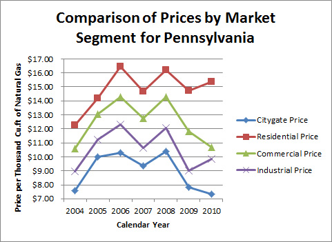 When comparing the prices per thousand cu.ft. of natural gas for each category of customer in Pennsylvania, clearly the residential customers are paying a much higher price than the commercial and industrial customers.